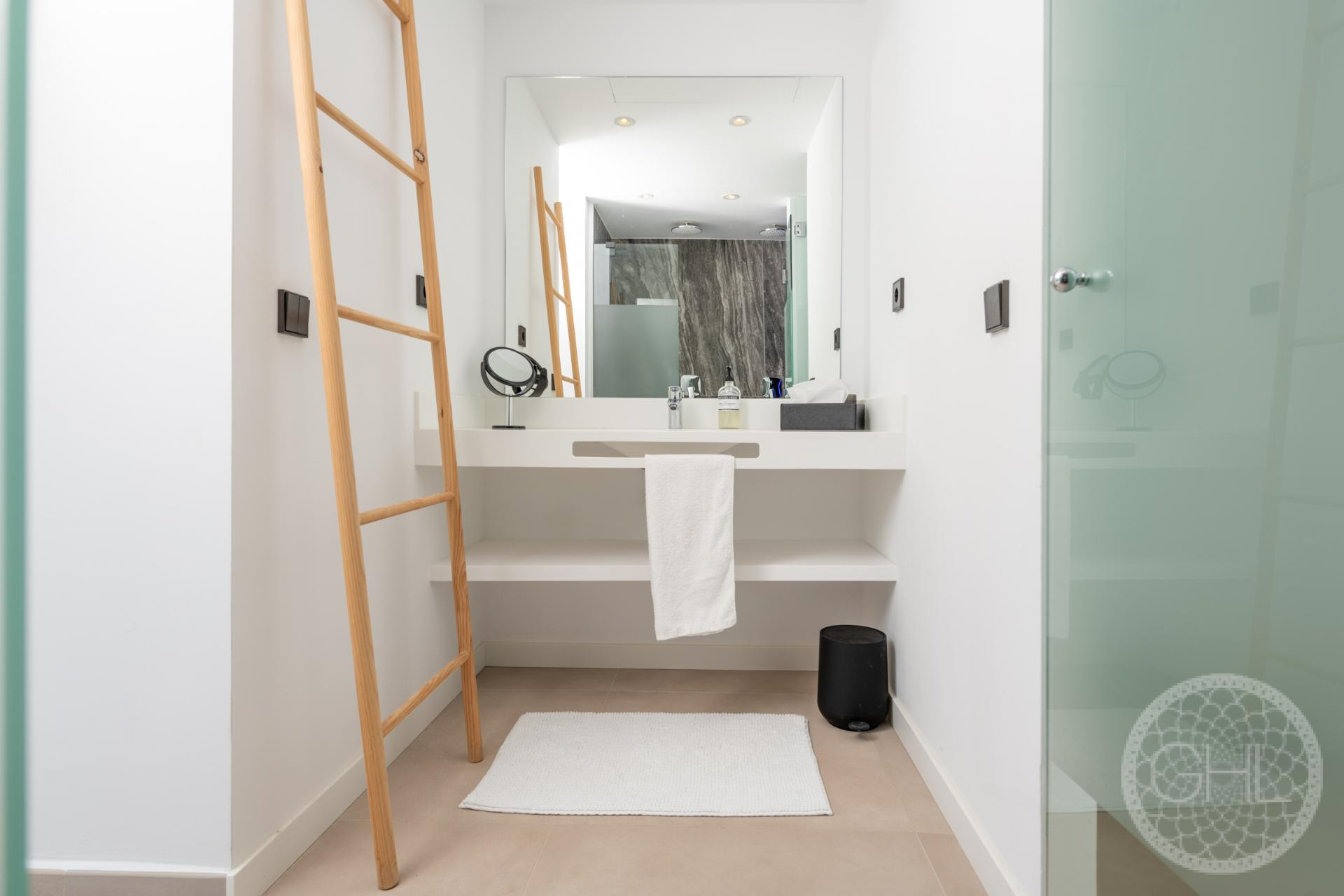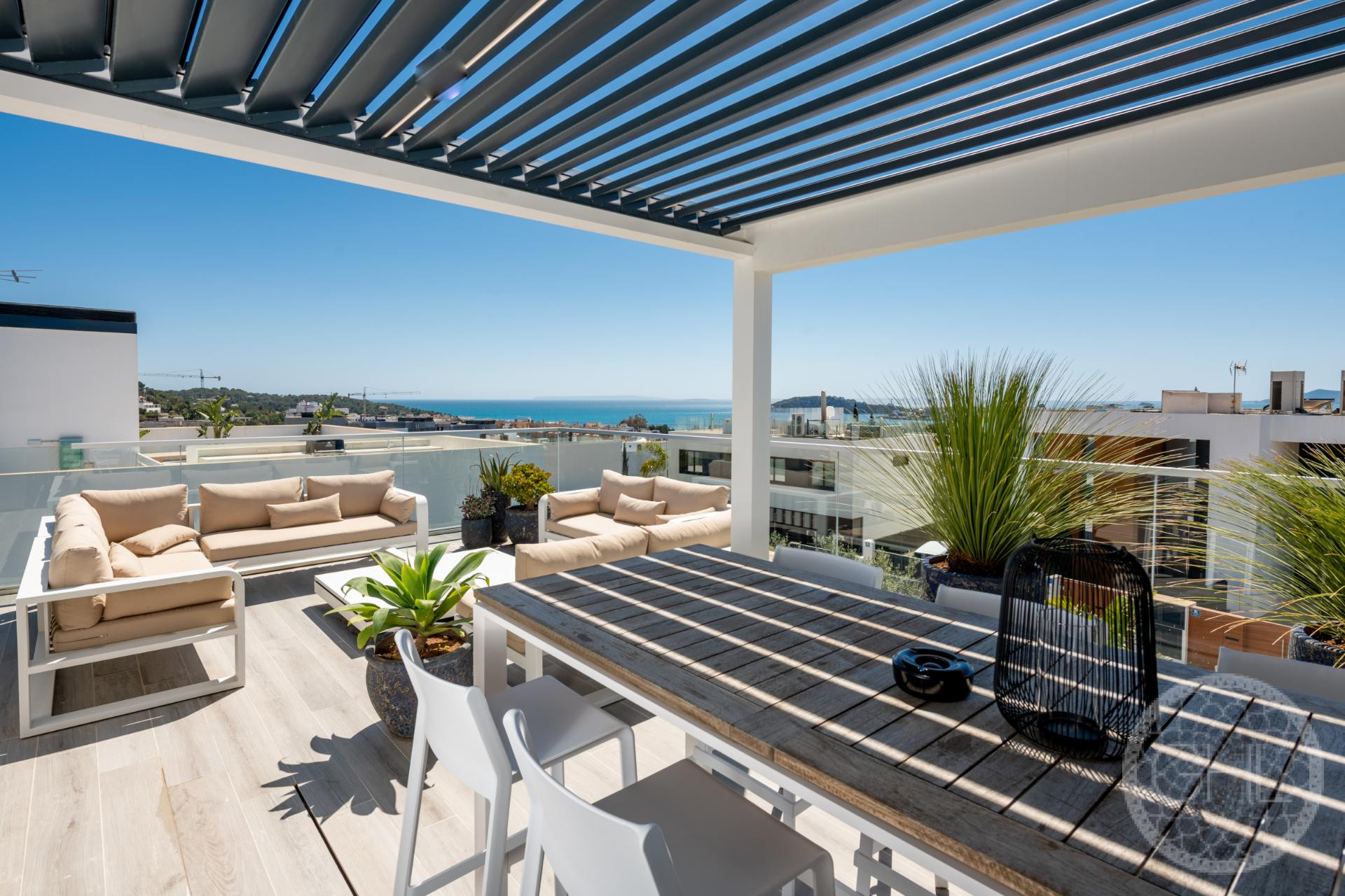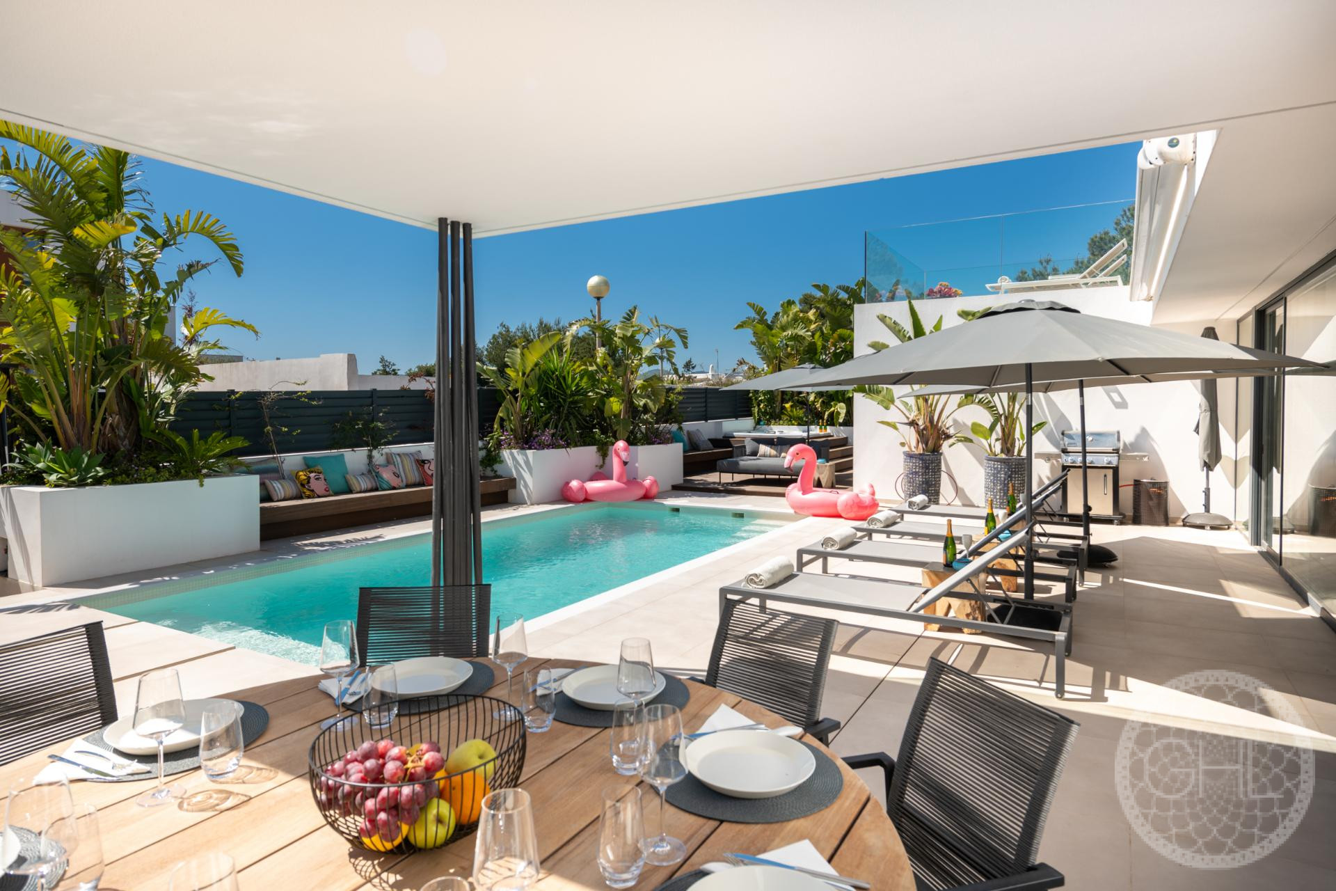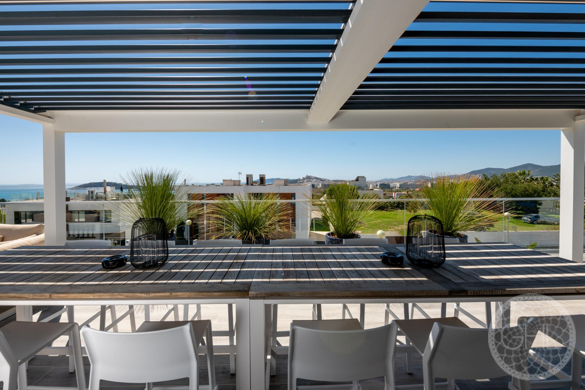 The crowning feature is the roof terrace, with a fully equipped summer kitchen, shaded dining space and sweeping views across to Dalt Vila—an idyllic stage for sunset gatherings and unforgettable evenings.