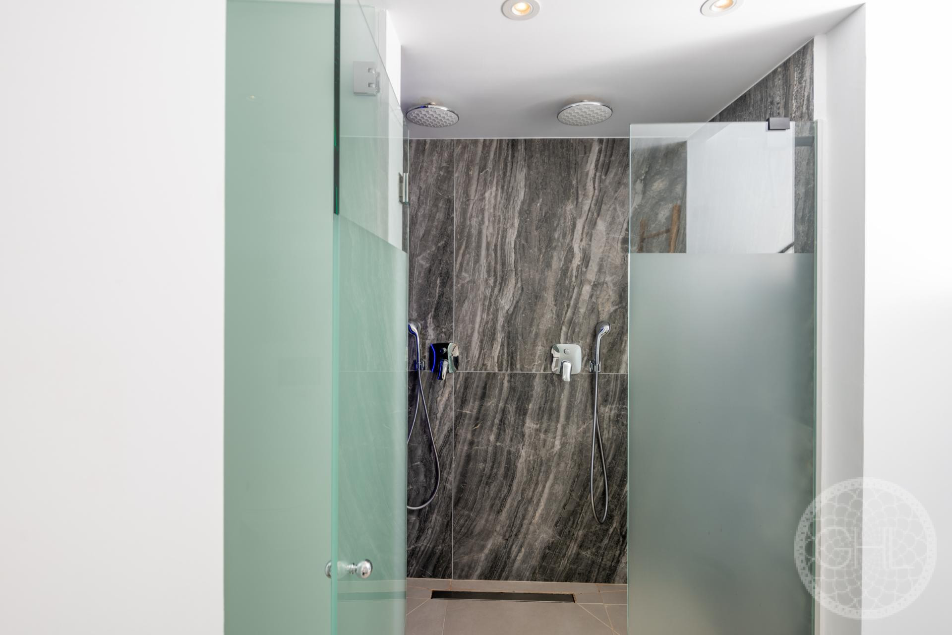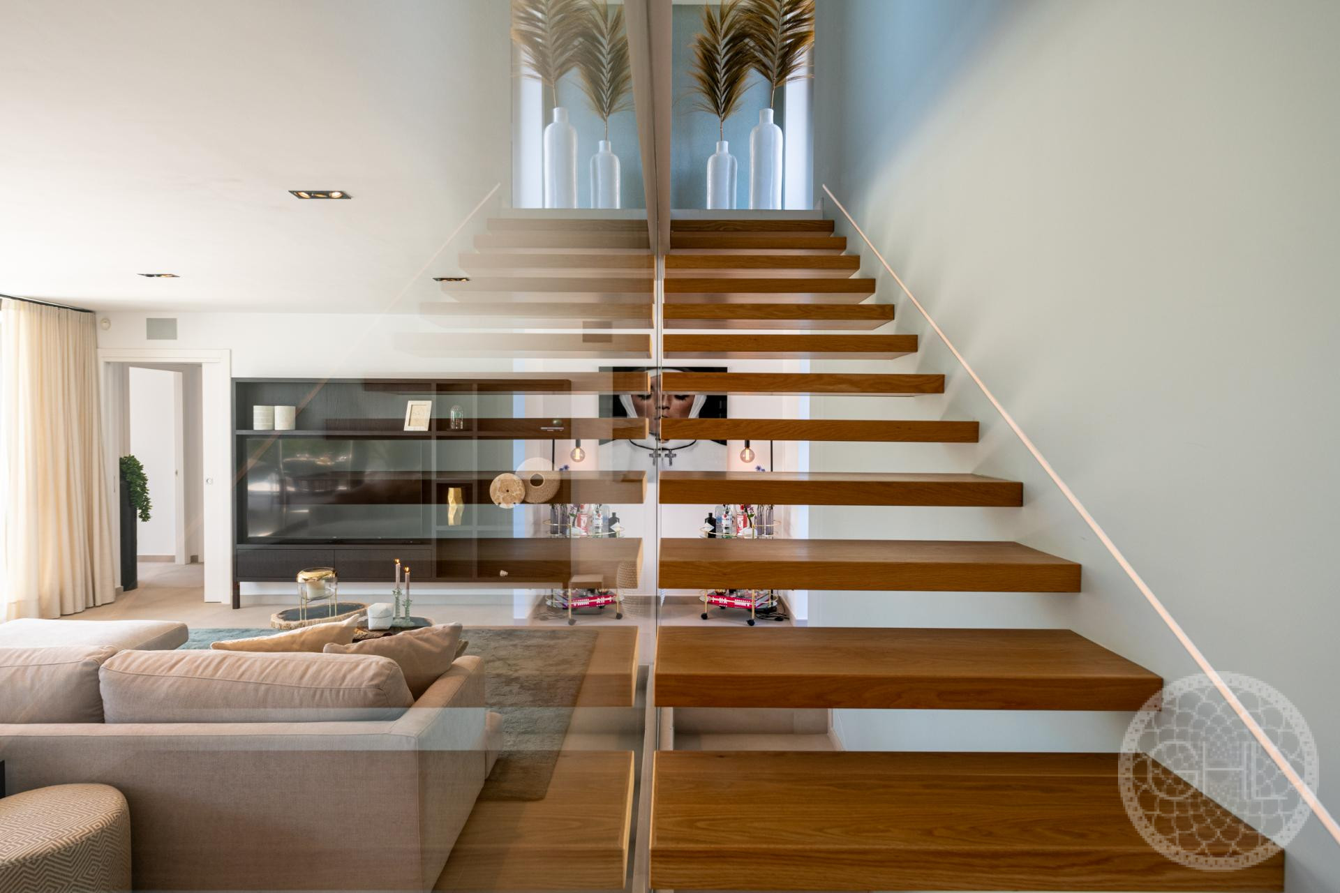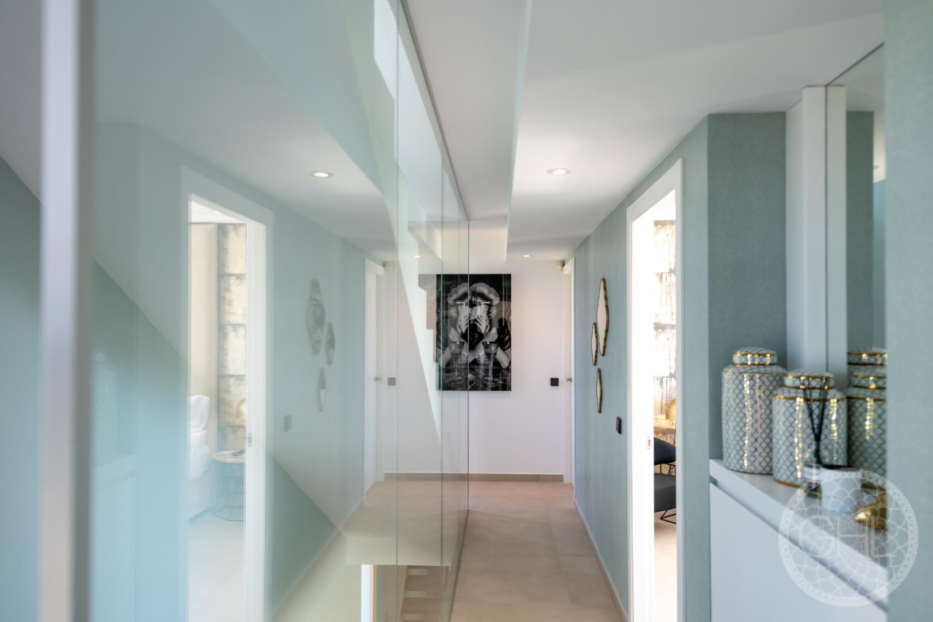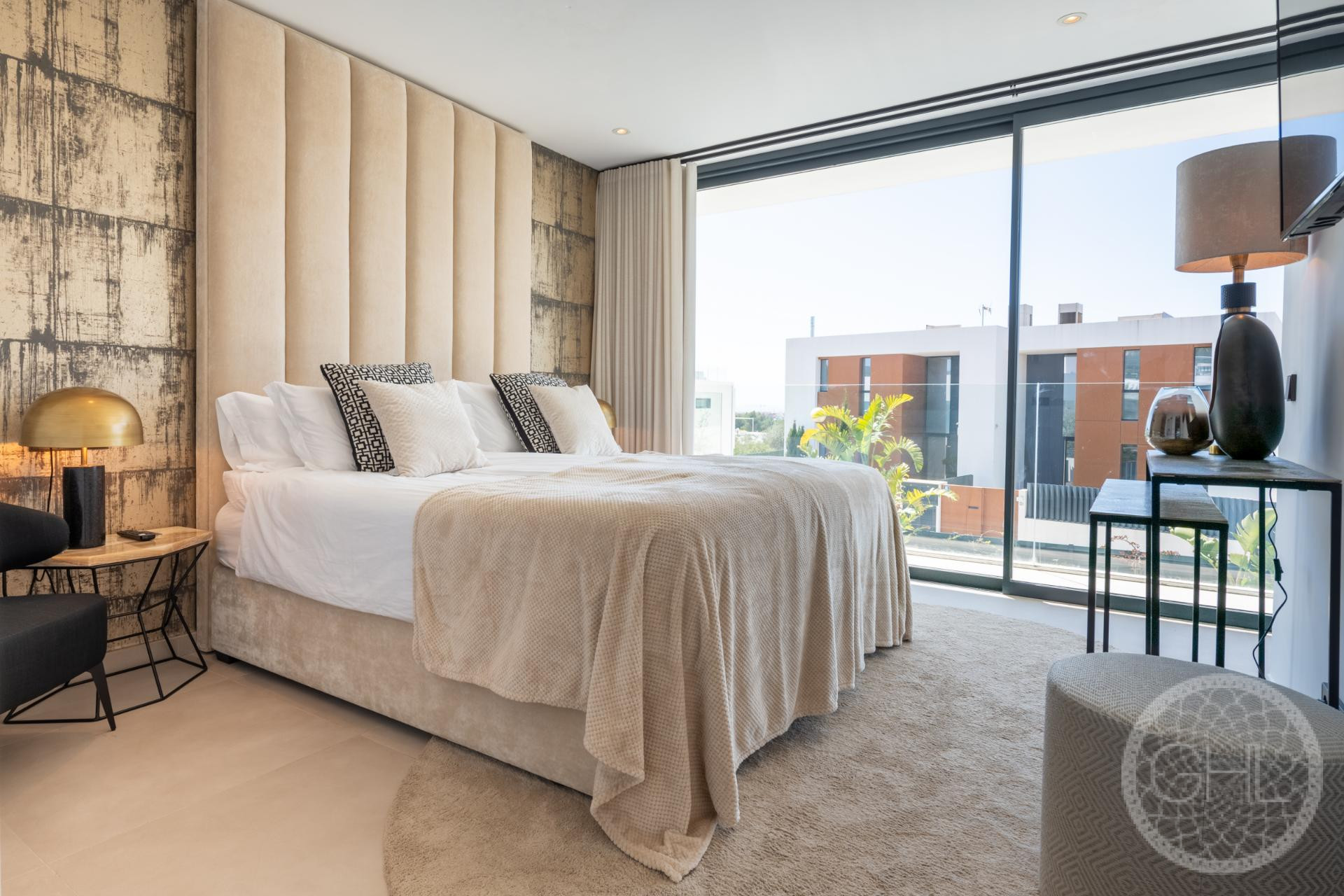 The villa blends striking contemporary architecture with the island’s unmistakable bohemian spirit. Six spacious bedrooms, each with an elegant en-suite, create private sanctuaries, while the open-plan living area flows into a sleek designer kitchen, finished in timeless tones with premium appliances. A dramatic floating staircase, encased in glass, adds sculptural impact and enhances the sense of light and space.