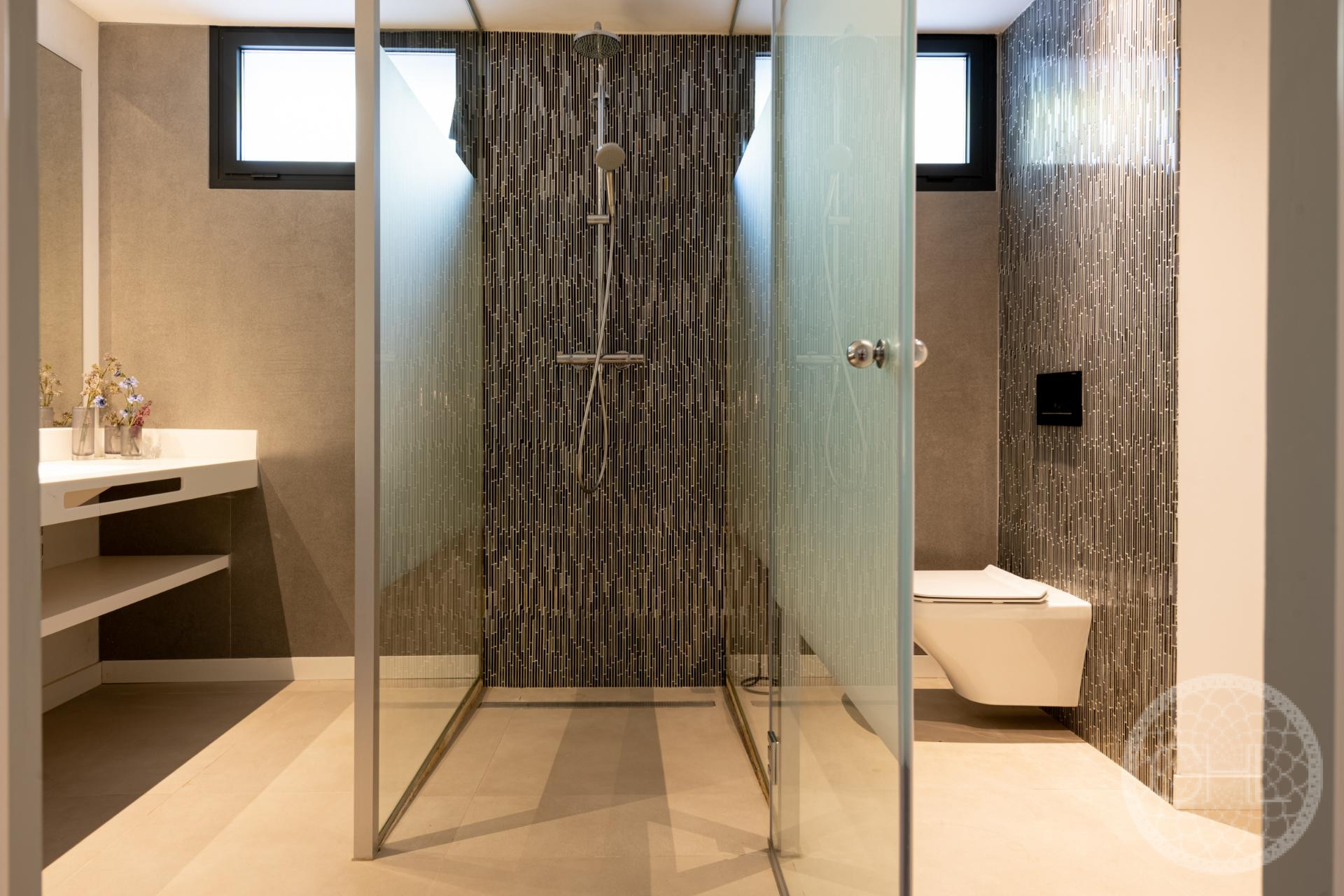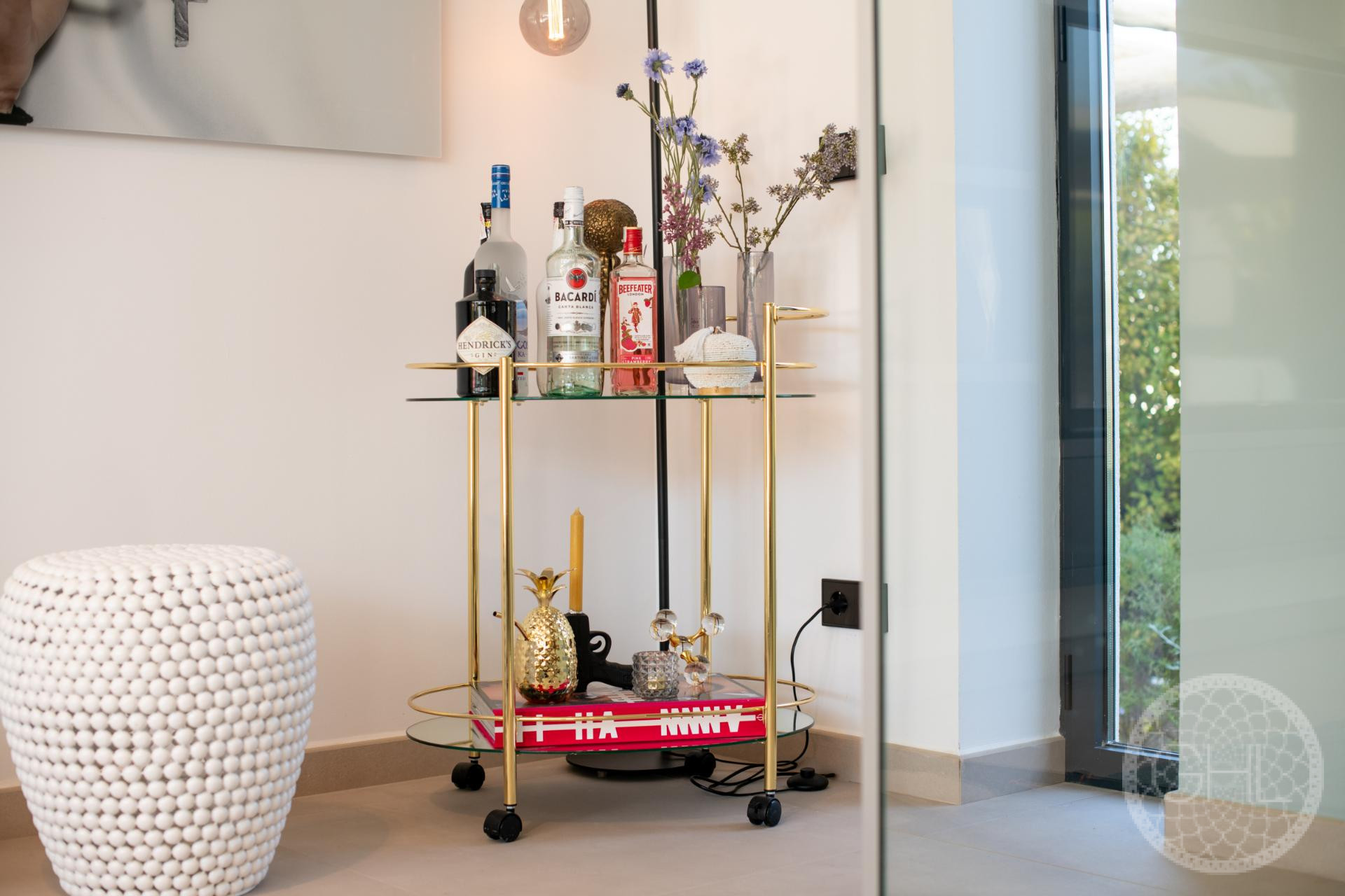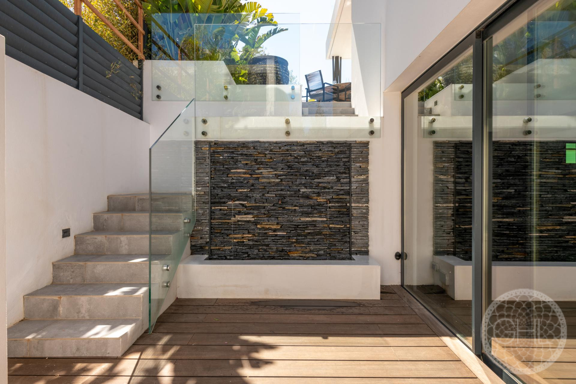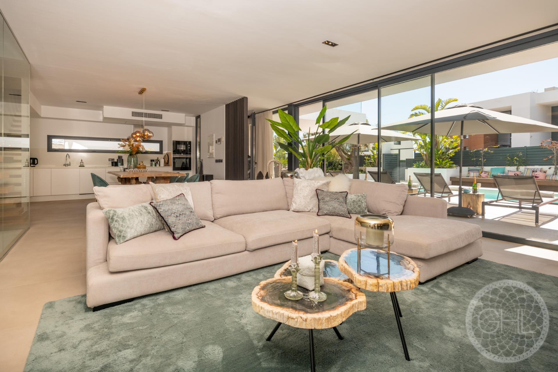 The villa blends striking contemporary architecture with the island’s unmistakable bohemian spirit. Six spacious bedrooms, each with an elegant en-suite, create private sanctuaries, while the open-plan living area flows into a sleek designer kitchen, finished in timeless tones with premium appliances. A dramatic floating staircase, encased in glass, adds sculptural impact and enhances the sense of light and space.