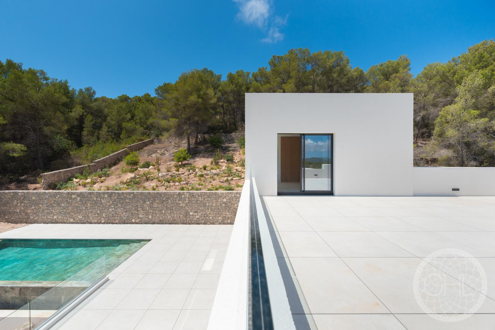 With expansive terraces, shaded dining areas, and a pool overlooking the surrounding greenery, the villa makes the most of Ibiza’s climate. From the upper level, views stretch over the golf course with glimpses of Cala Llonga in the distance.
